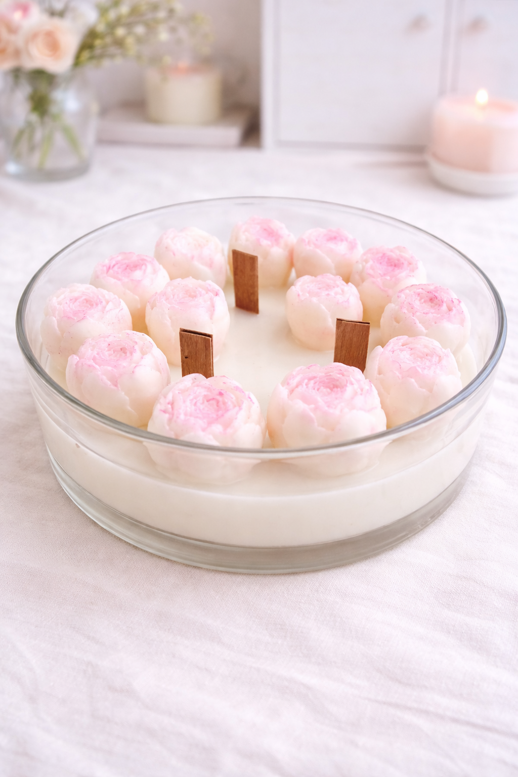 Un aranjament floral spectaculos, realizat manual dintr-un amestec premium de ceară naturală de cocos, soia și ceară de albine, inspirat de frumusețea catifelată a bujorilor în floare.