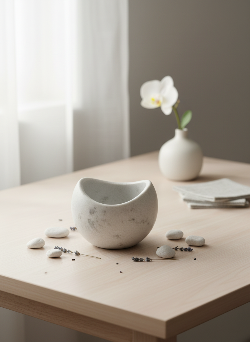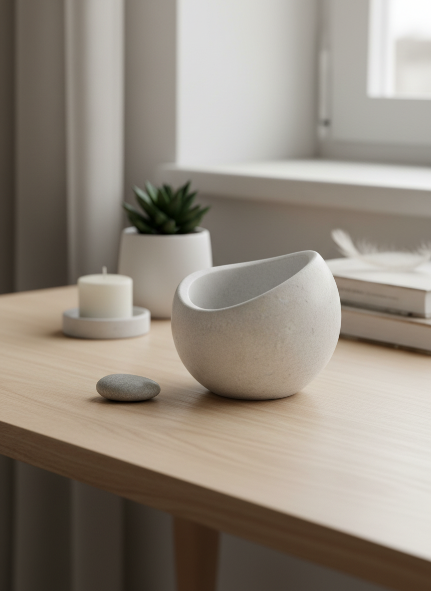 Recipient turnat manual din Jesmonite, în atelierul Alinturi. Jasmonite este un material compozit mineral-acrilic pe bază de apă, cunoscut pentru durabilitatea și aspectul său elegant. Fiecare piesă este turnată în matrițe premium și finisată manual, ceea ce face ca nuanțele, textura și micile detalii să fie ușor diferite.