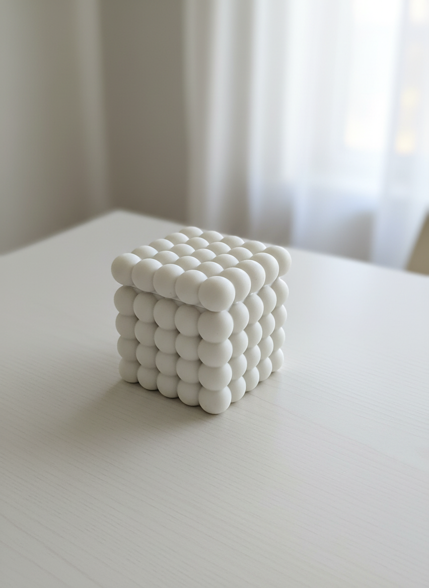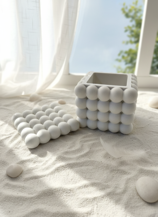 Suport decorativ Cub Bubble din Jesmonite, perfect pentru Ceara Alintată, lumânări, bijuterii sau mici accesorii. Minimalist, versatil și elegant. Dimensiuni: 8.2 × 8.2 cm.