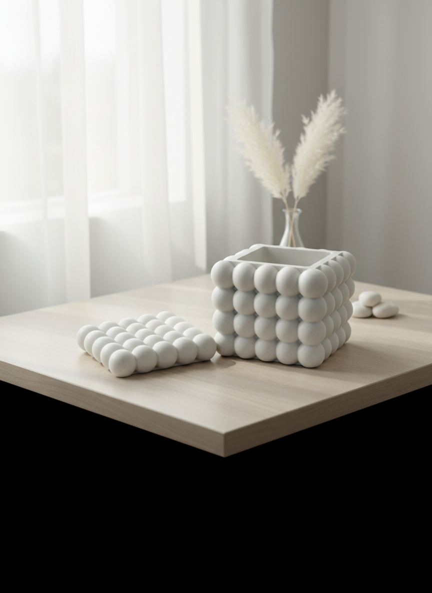 Adaugă un accent modern și sofisticat în decorul casei tale cu Suportul Cub Bubble, realizat manual din Jesmonite — un material premium, ușor, durabil și prietenos cu mediul.